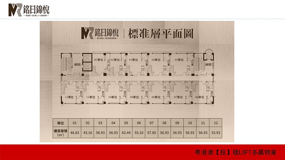 项目主要产品为 4.8 米层高 LOFT 商务公馆,买一层送一层。超高实用率,投资自住两相宜。项目共建 1 幢 13 层 132 户商业公寓楼,3-10 层为复式公寓,11-13 层为平层公寓,商业用户 11 户,1 层为层高 5.9m 商铺,2 层层高 3.7m 商铺,配建地下停车位 68 个。