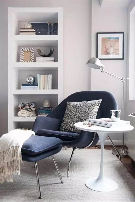 3)一盏可以调节和移动的落地灯,让阅读灯光更适合。这三个要素都不需要前期改造,想要阅读的时候临时准备就可以了,不需要砸墙各种,最省力省时。