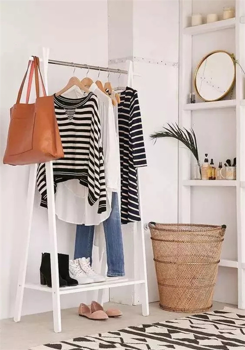 或者可以选一个可移动衣架,下面放鞋子、旁边挂包包,推拉自如,灵活匹配你各种需求。